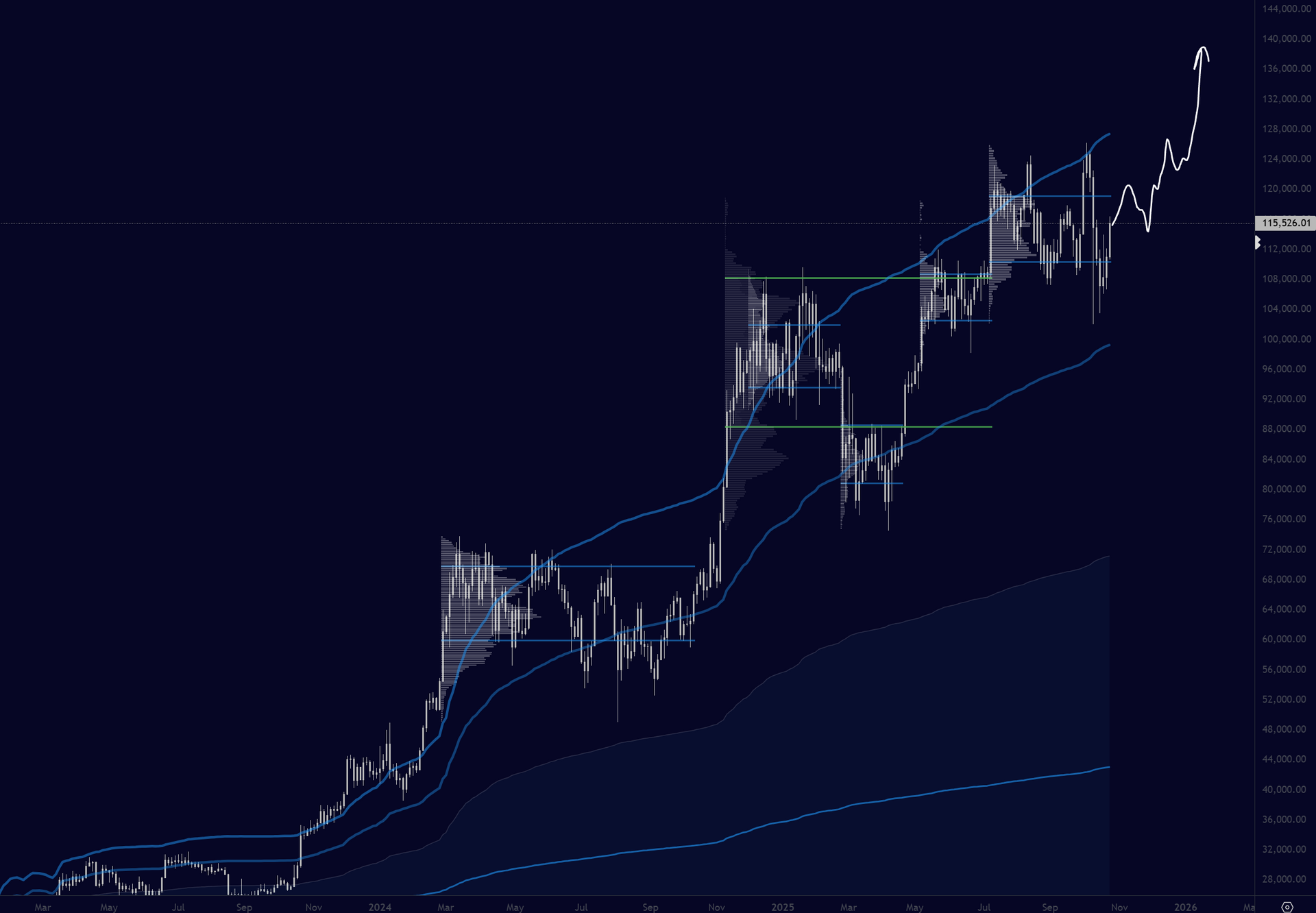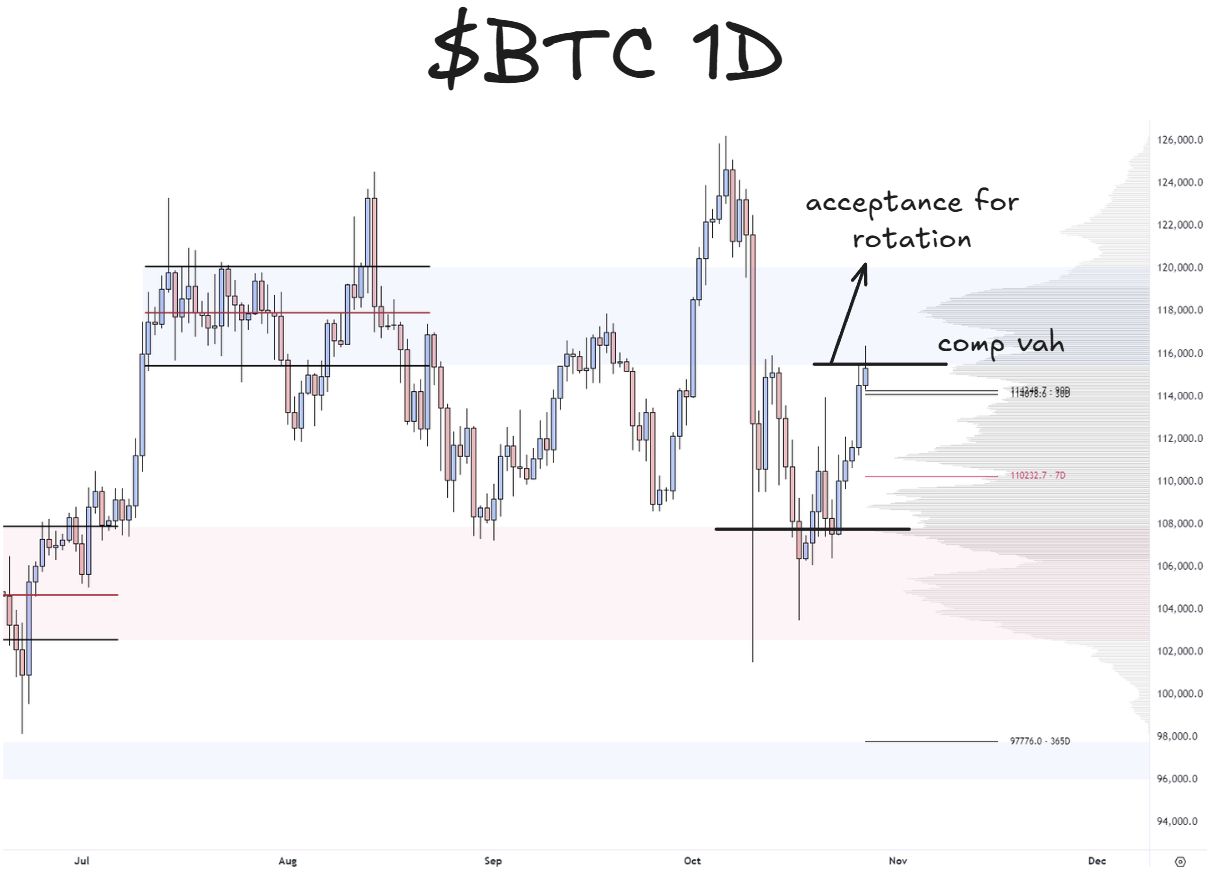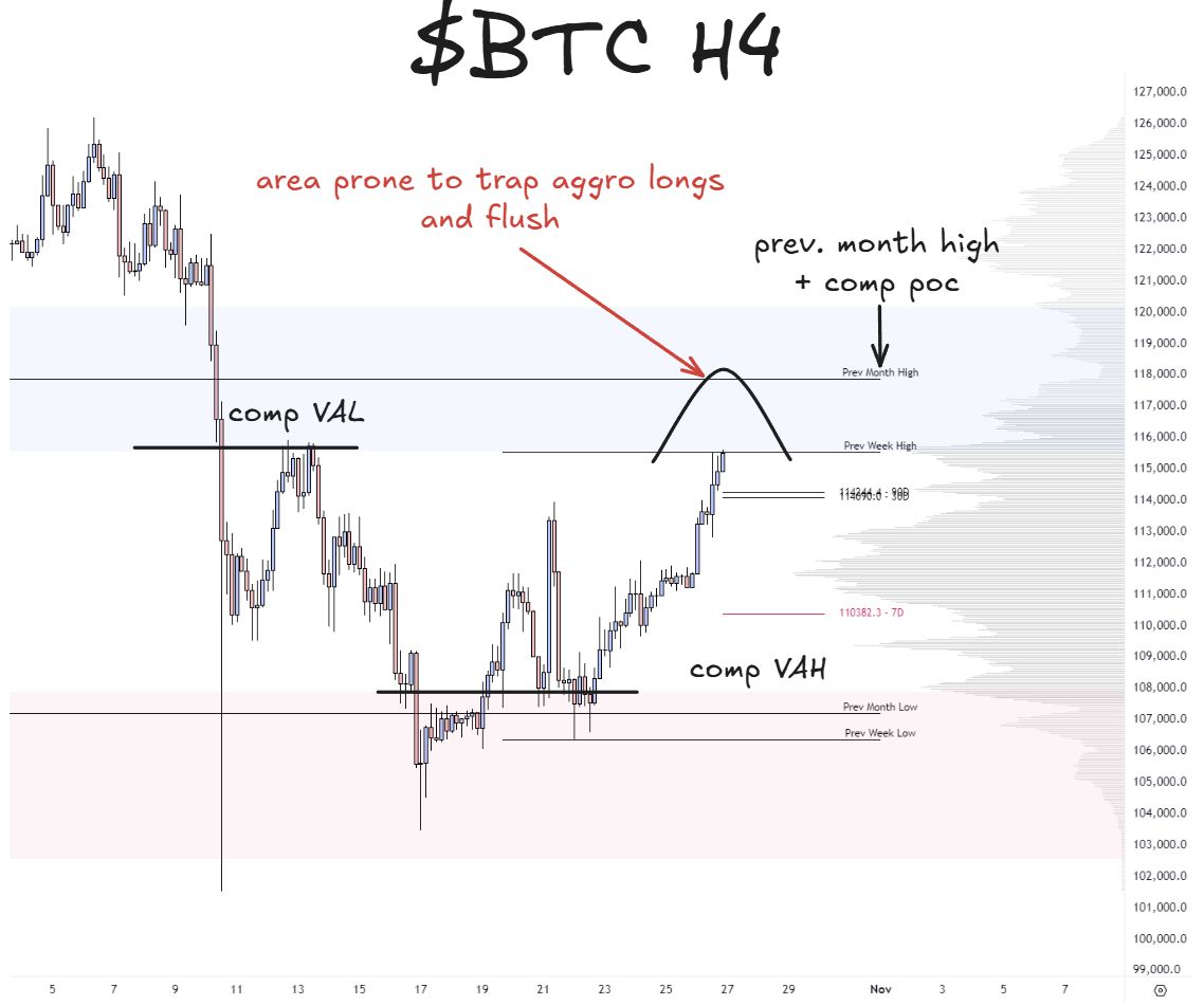 the previous week high (116k) to previous month high (118k) region is prone to reversion if aggressive longs pile in and momentum stalls
