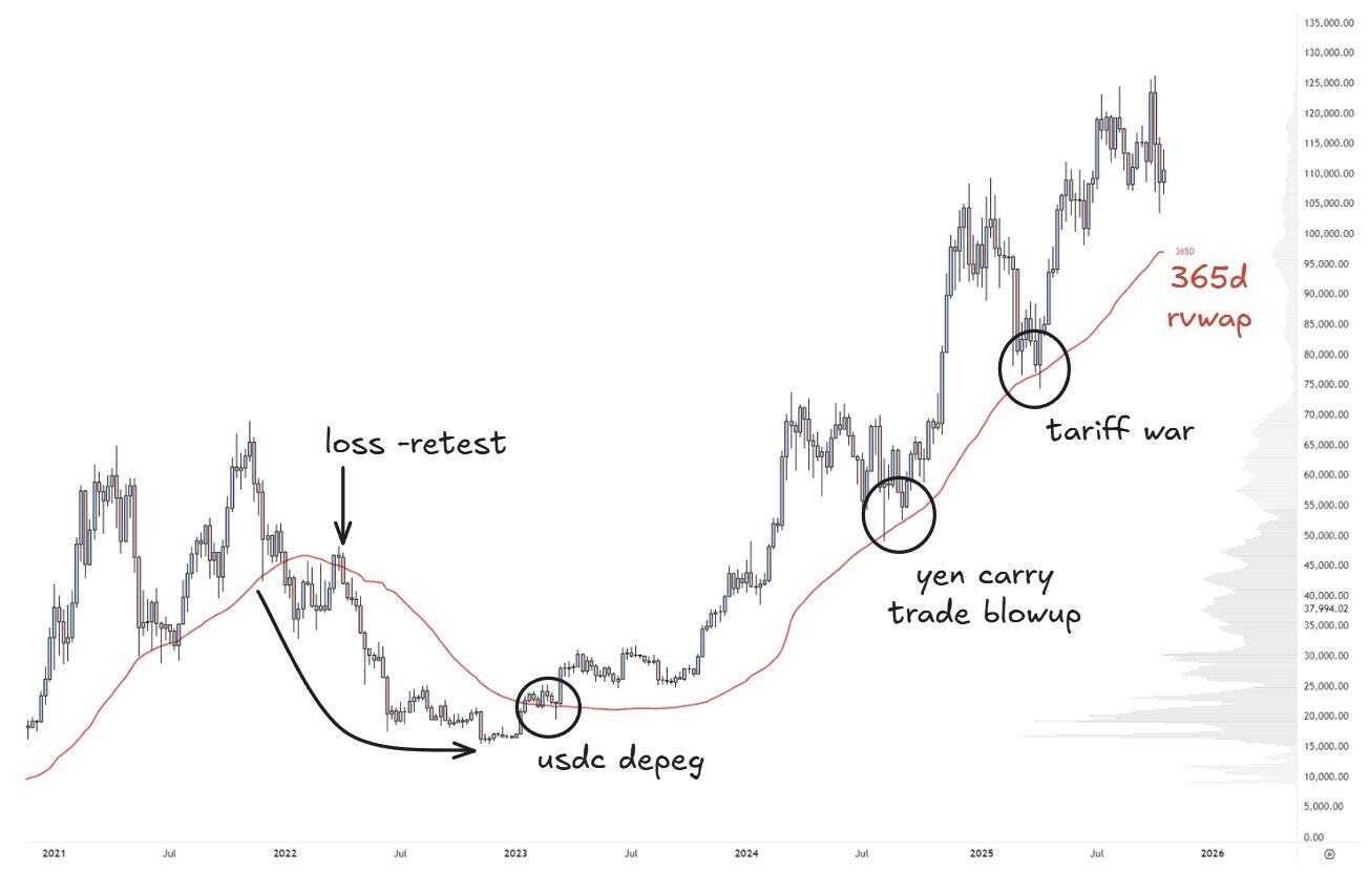 Zooming out, the 365d rolling VWAP serves as a coarse divider for HTF bias: