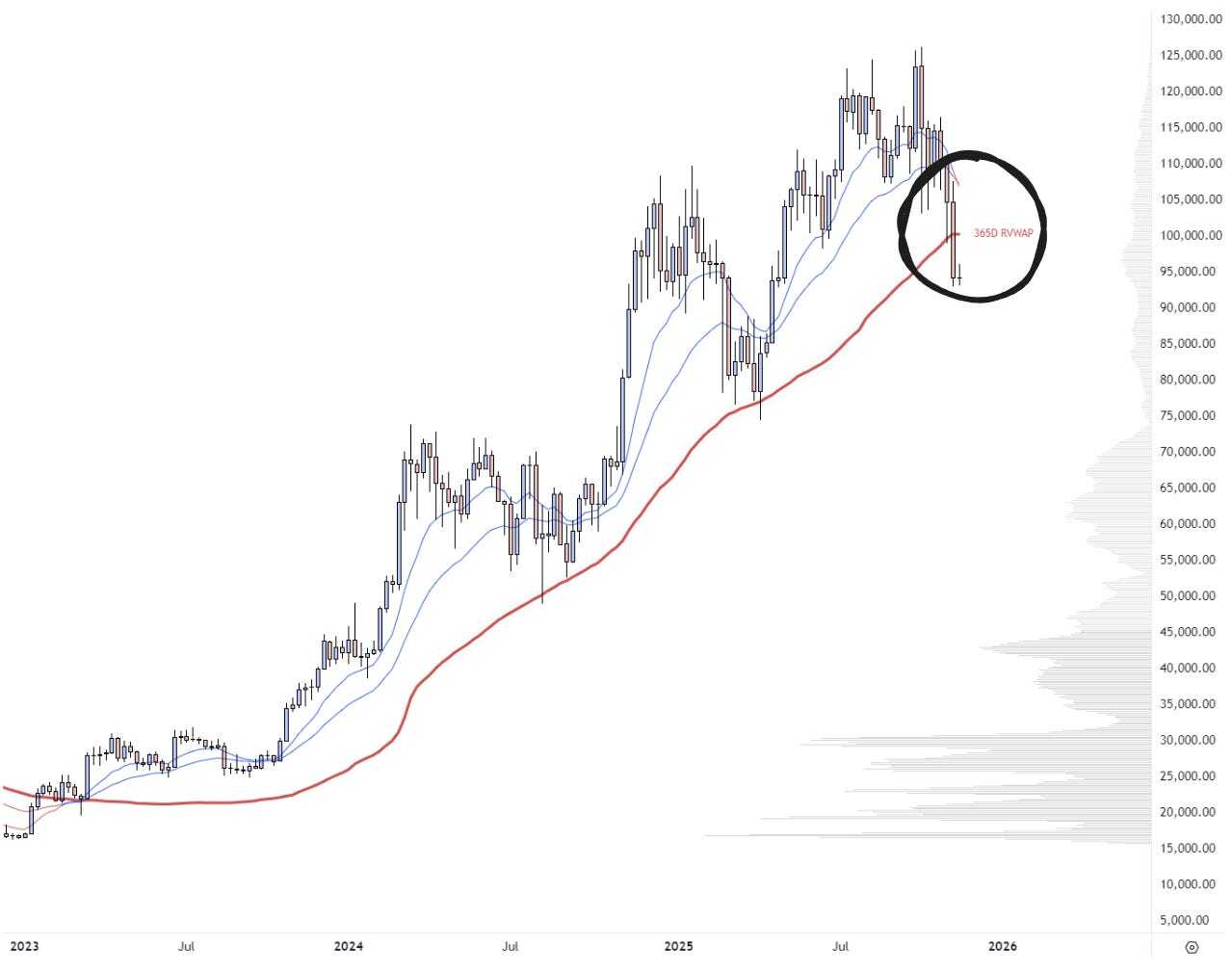 Loss of the 365d rolling VWAP and the 100k psychological level combined with the weekly trend starting to shift red points towards being defensive to say the least.