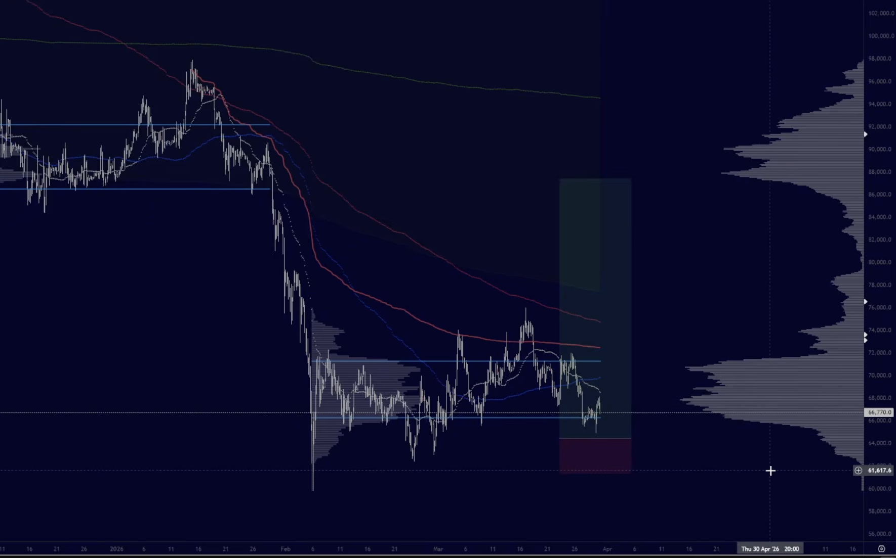 Heading into Q2 with BTC pressing quarterly value area lows, the dashboard is showing what you'd expect, a wide spread.