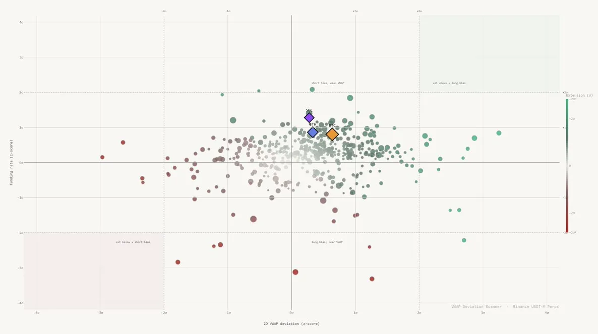 For each one, it measures how far price has drifted from its own rolling average, weighted by volume. Think of it as a "how abnormal is this move?" score for every coin at once. One view, refreshing every 5 minutes.