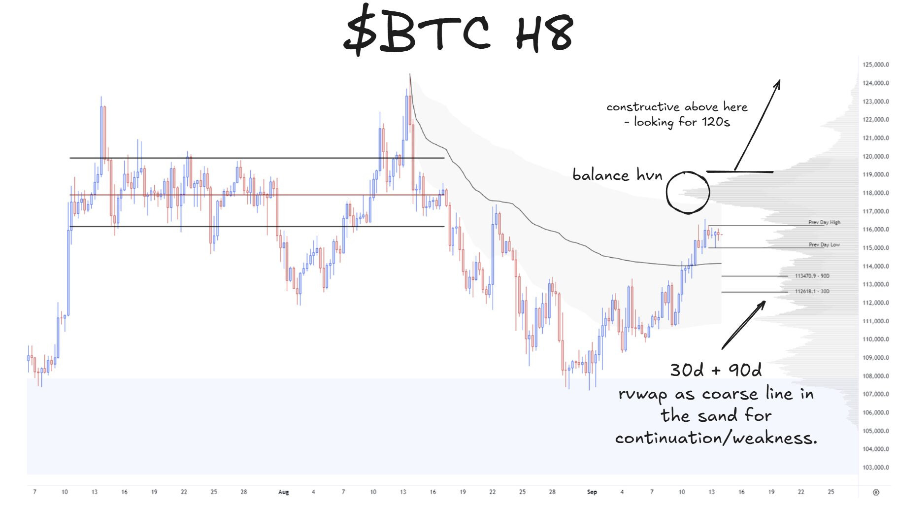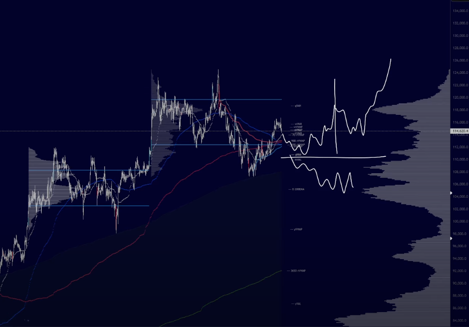 Above 30/90d VWAP (112-113): targeting 118s, extend to 120s+ if HVN flips