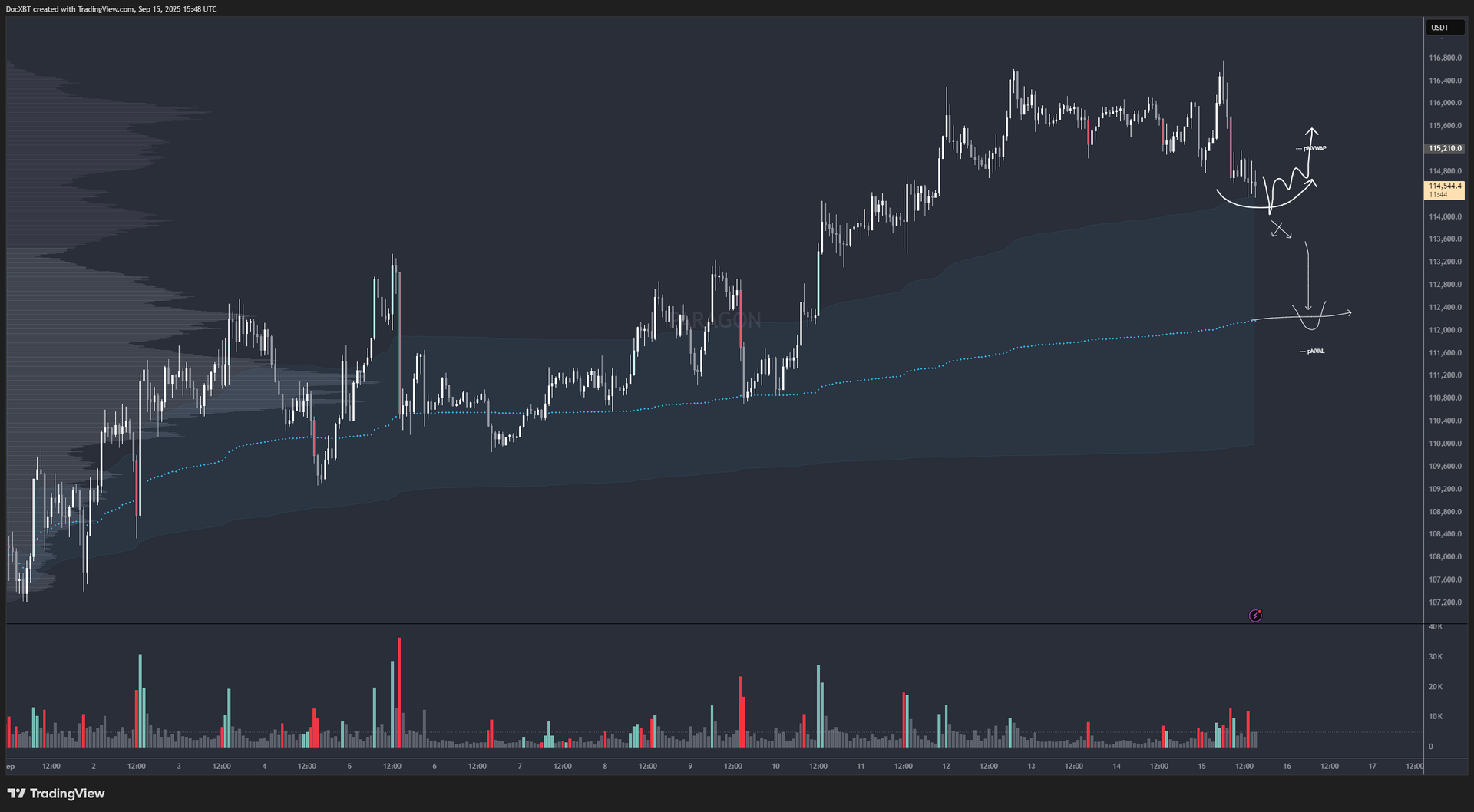 Bulls need to hold above 114.2 (monthly VAH) to maintain bullish momentum. A break below likely triggers a rotation down toward the monthly VWAP around 112.