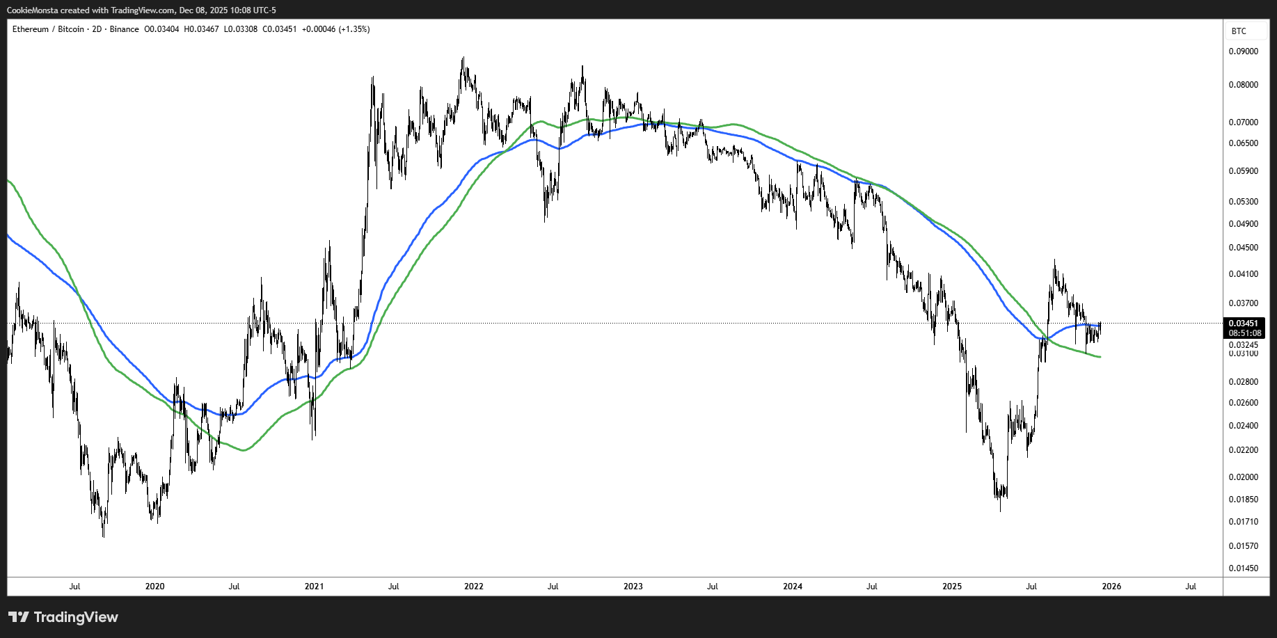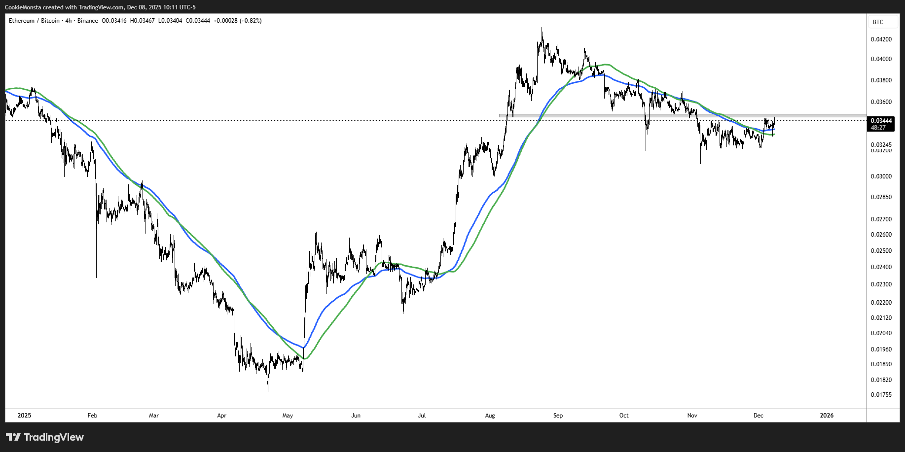 ETHBTC’s 4H 200 MAs are a key inflection point, signaling that if the market rallies from here, ETH (and likely alts) will be the place to watch for outsized returns.