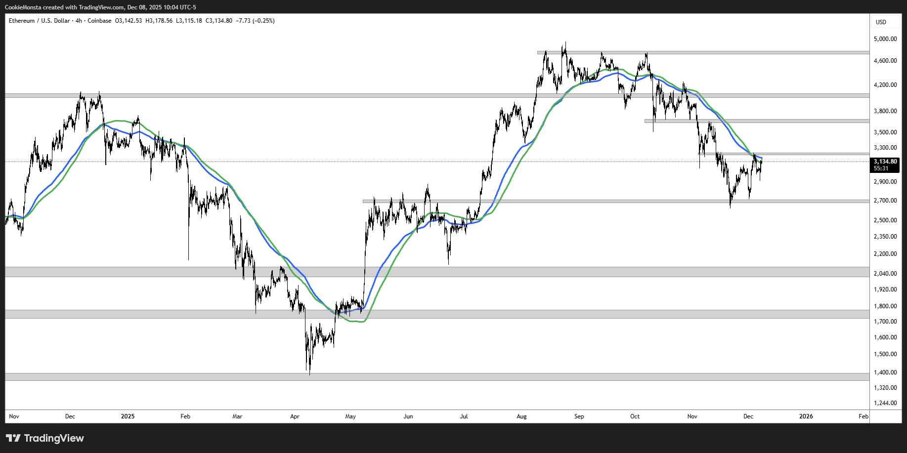 As Bitcoin chops sideways in a range, Ethereum has seen enough strength to rally into a bearish retest of HTF trend, the 4H 200 MAs.