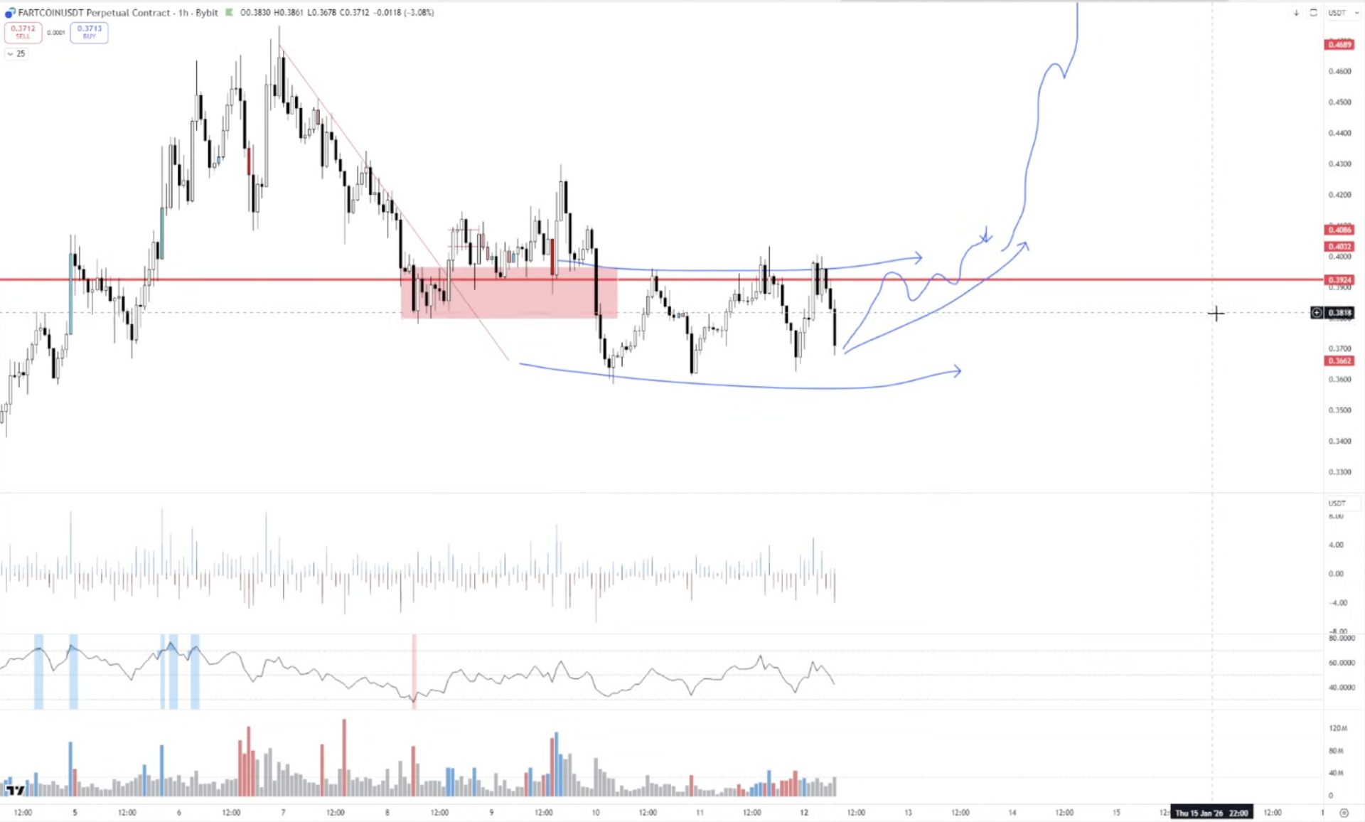 FARTCOIN — at a high timeframe pivot, consolidating after that downtrend failed to break down. If it breaks out into a trending move, we could see a 10-20% rotation.