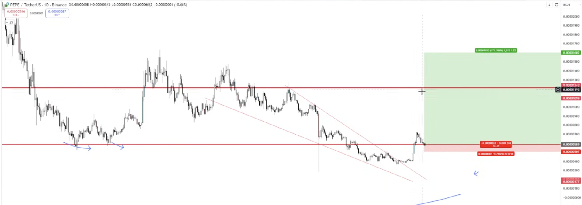 PEPE — the support on the daily is mental. Can't justify blind bidding it, but if it shows relative strength, could be a really good trade.