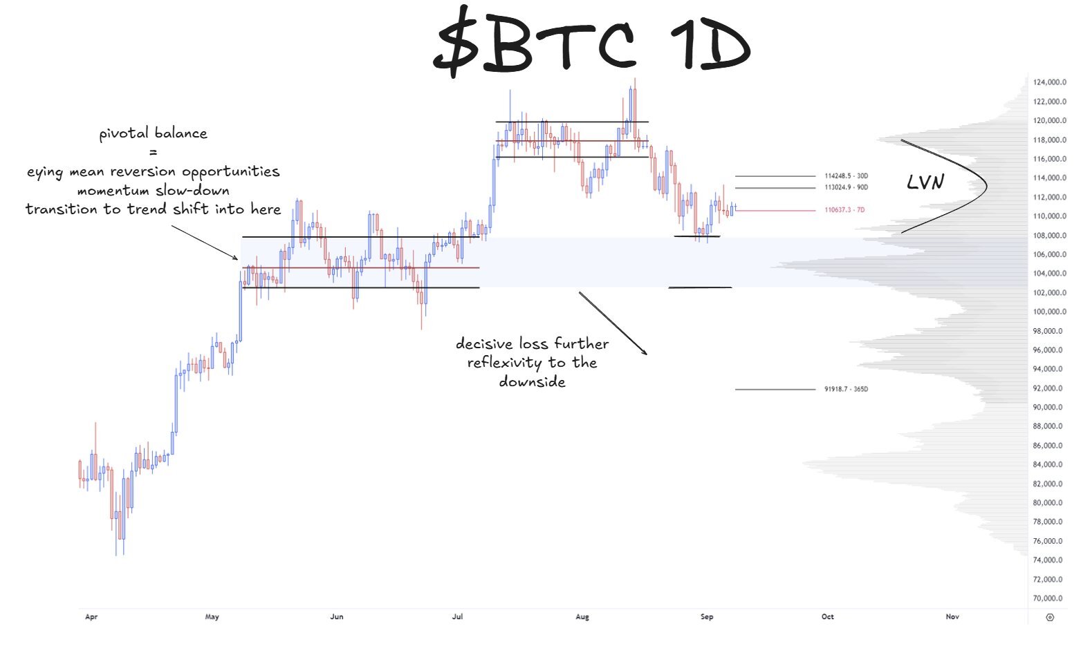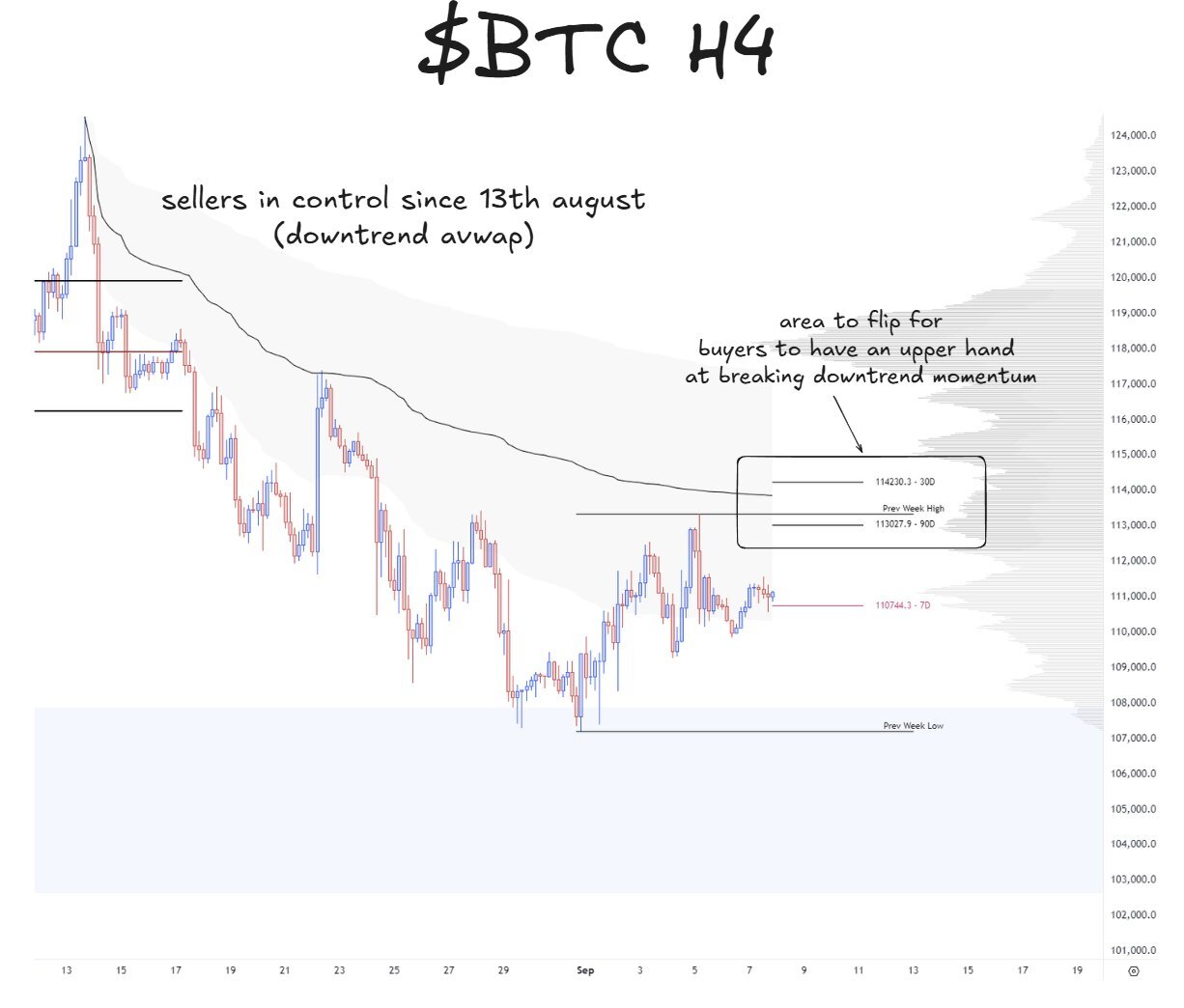 BTC has been bearish on the H4 since mid-August. A key region to flip for bulls is 113-115:
