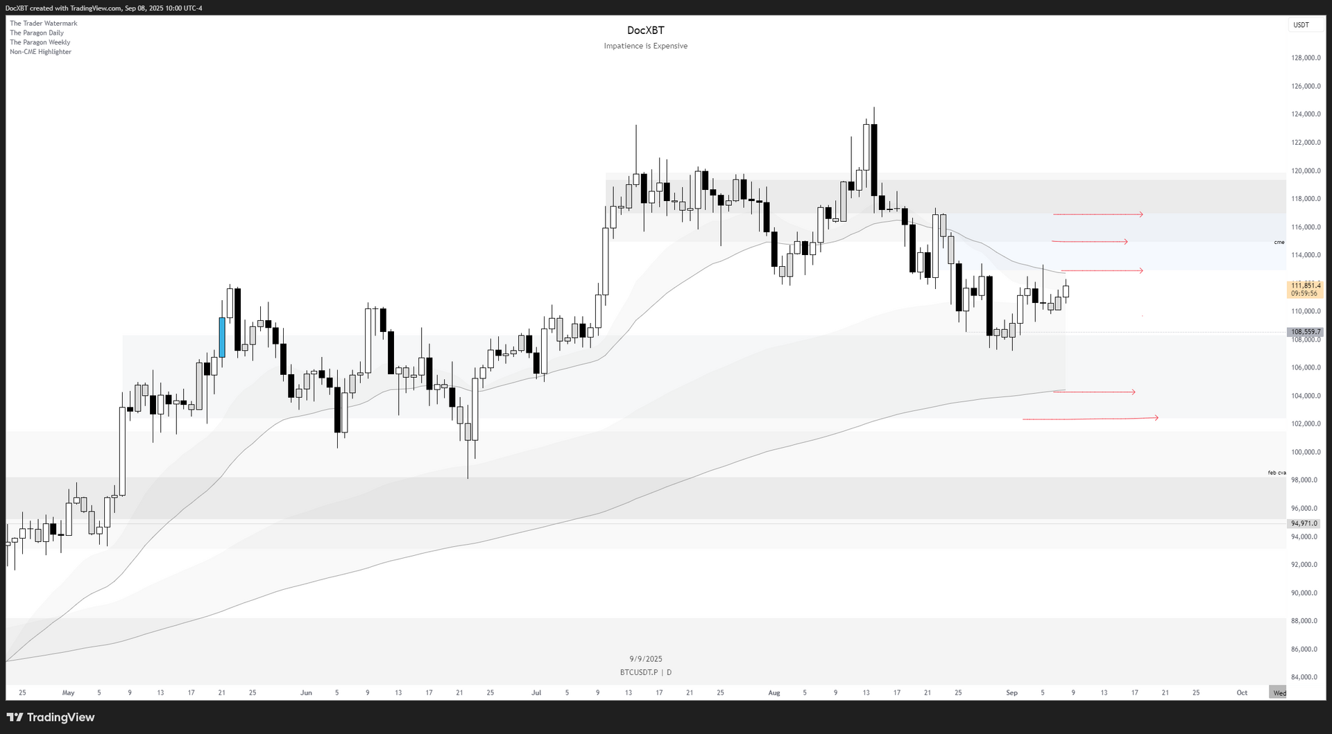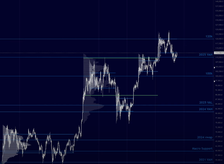 Long around 108/109k, derisk around 112/113 (I rarely short in HTF bull trends).