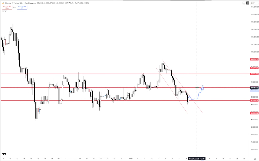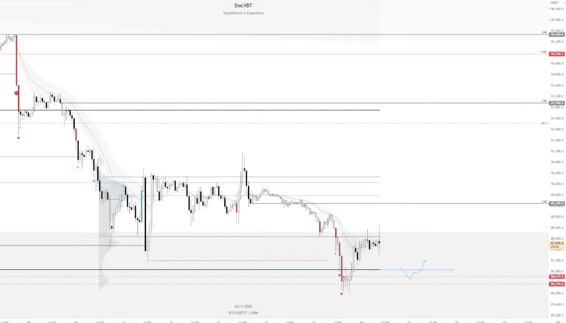 If we can get acceptance back above $88.3k (H4 trend + previous week range lows), I'm looking for rotation up into the 90s.