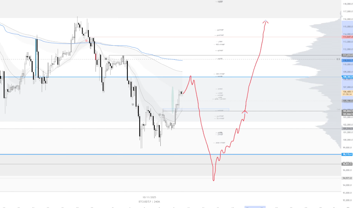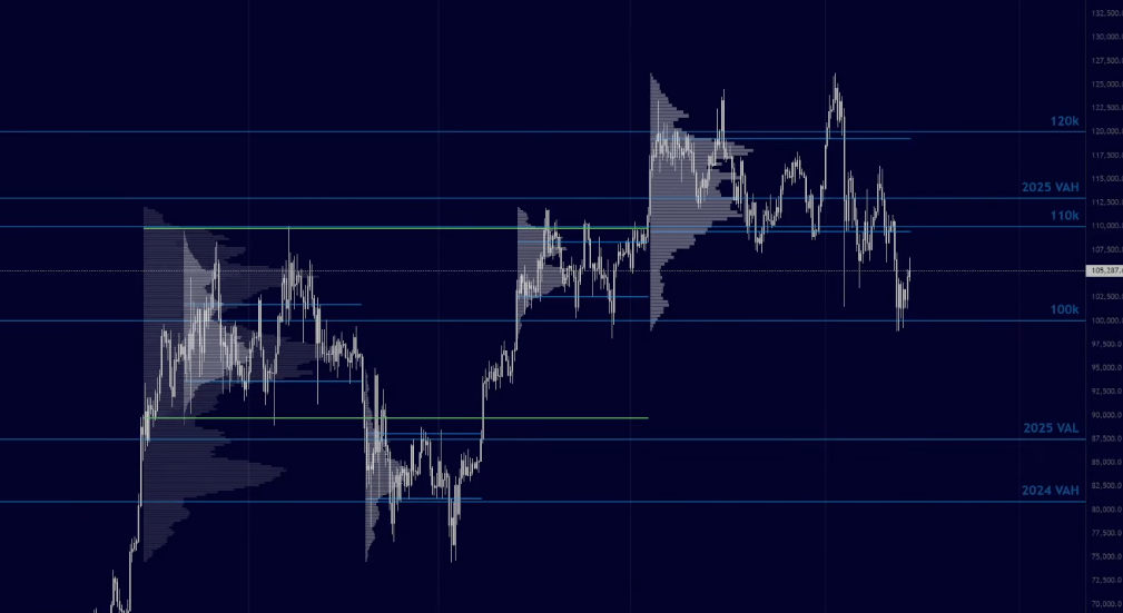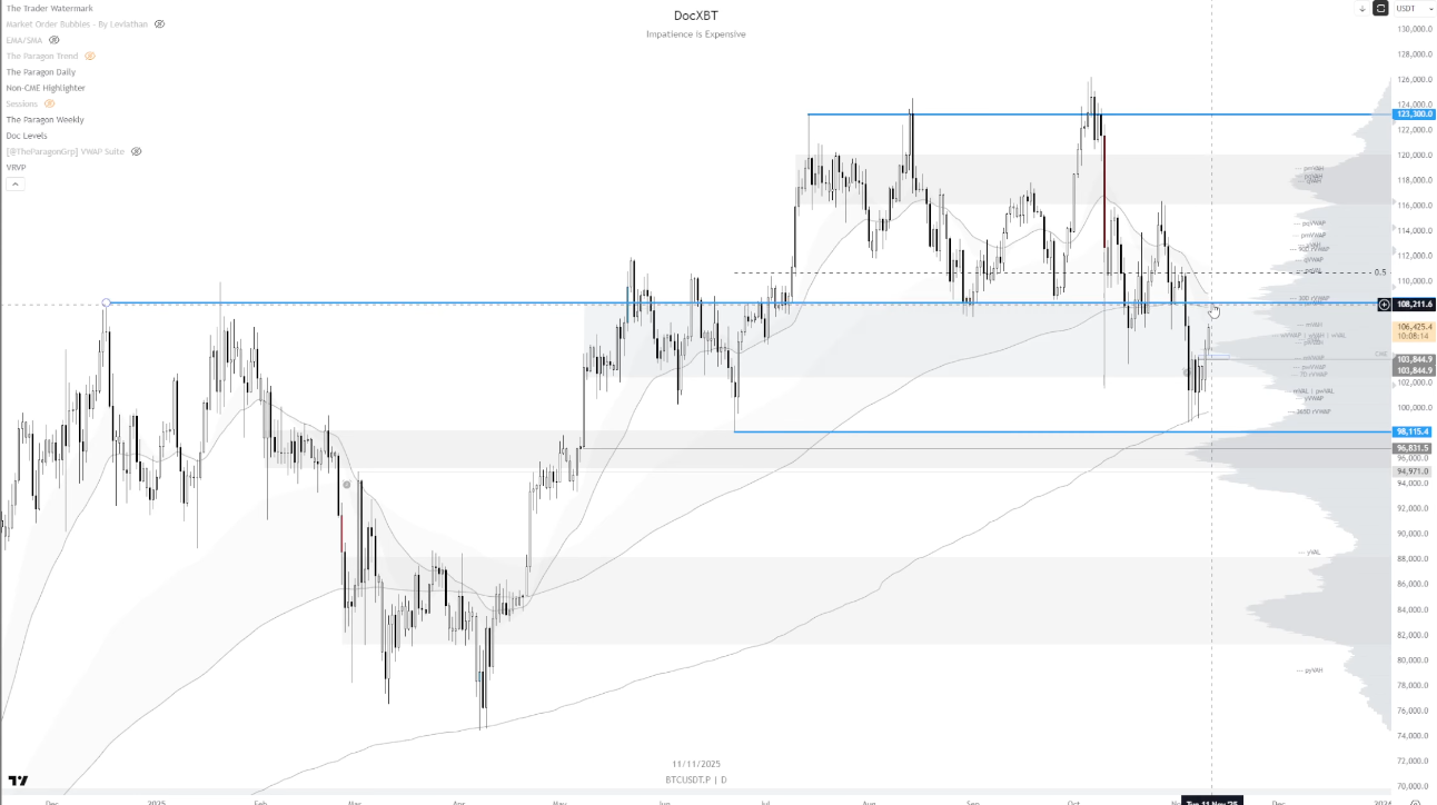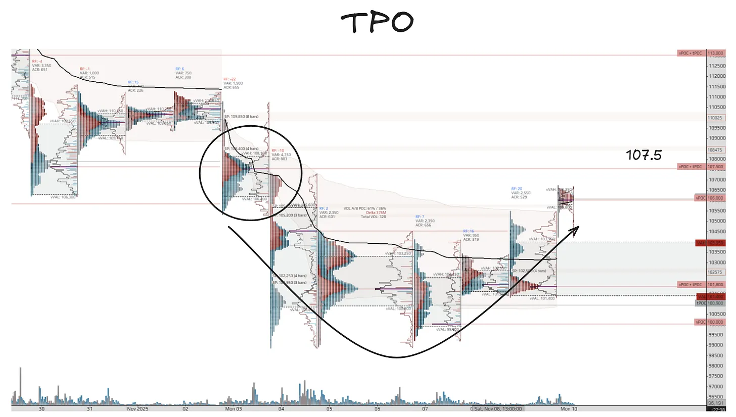 The TPO also shows the 108k region as a key pivot point – it was the session before the unravel.