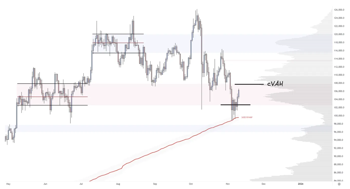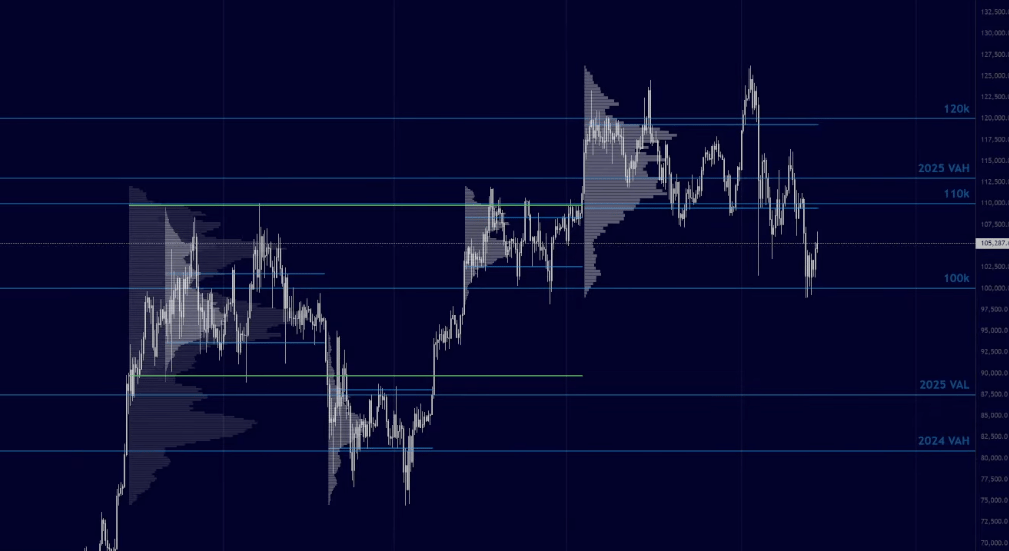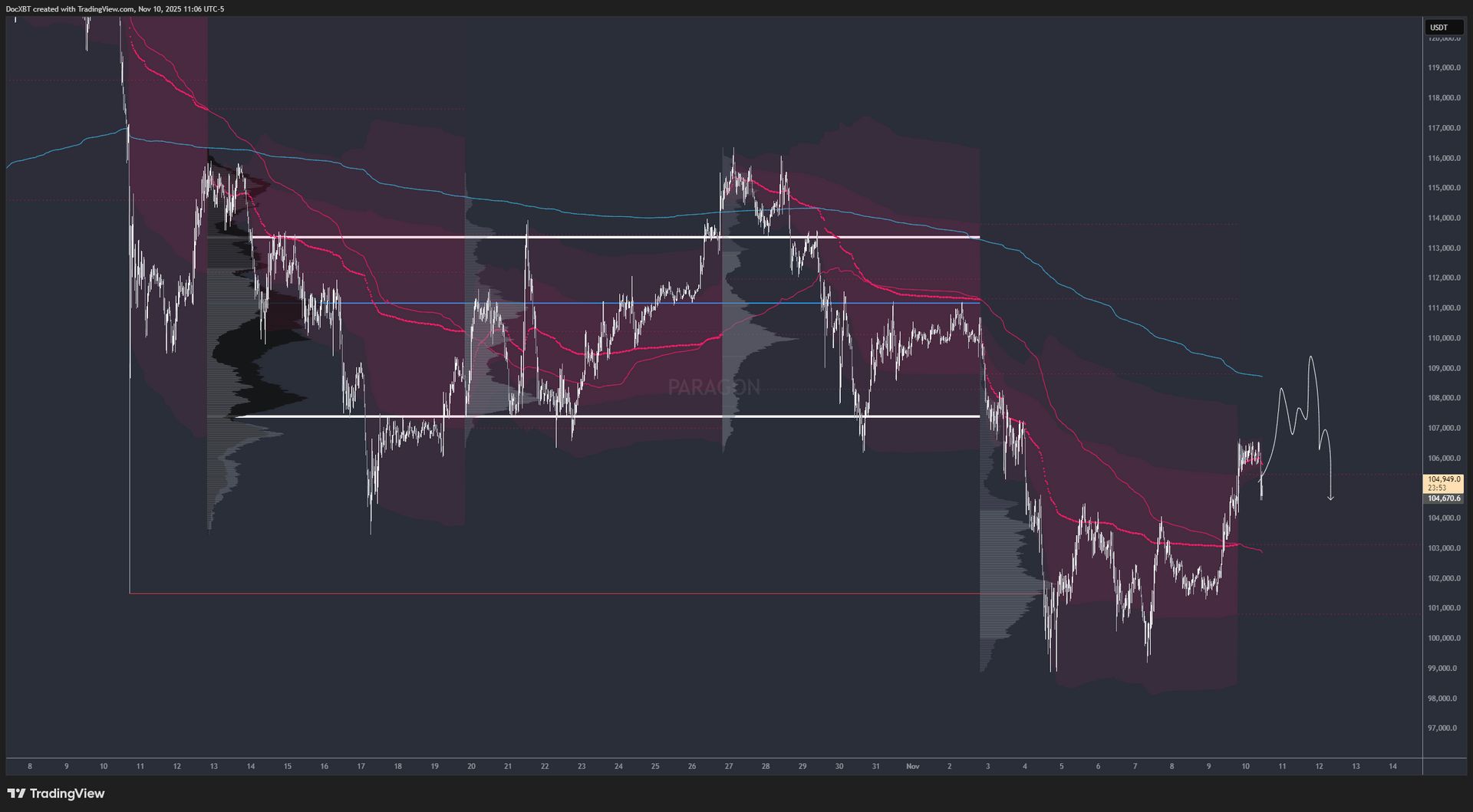 The TPO also shows the 108k region as a key pivot point – it was the session before the unravel.