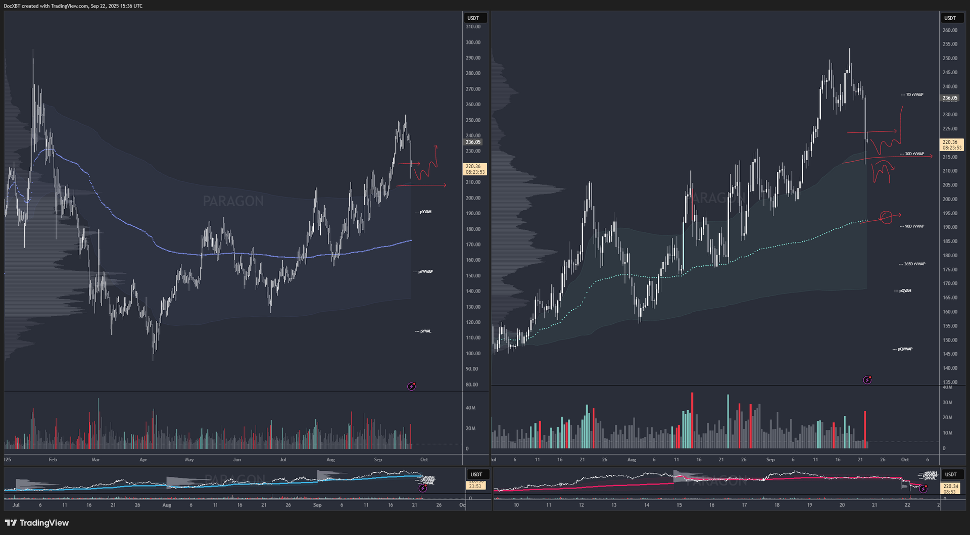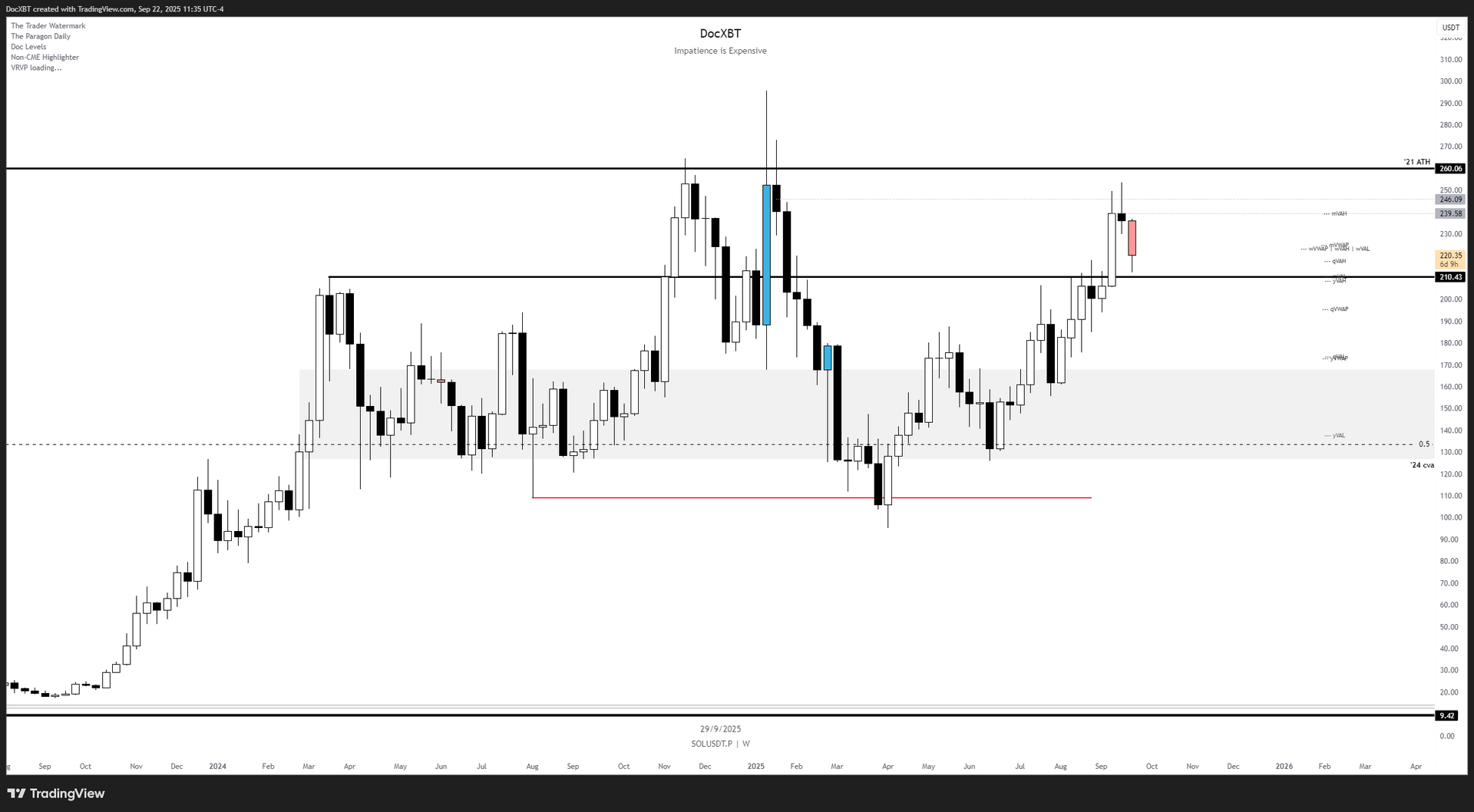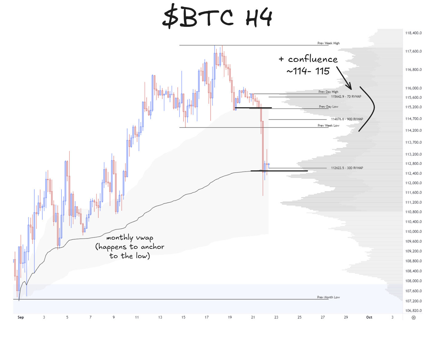 Price spiked through the monthly VWAP (which also happens to be the anchored VWAP from the swing lows), and is under the previous week low, 7D and 90D rolling VWAPs.