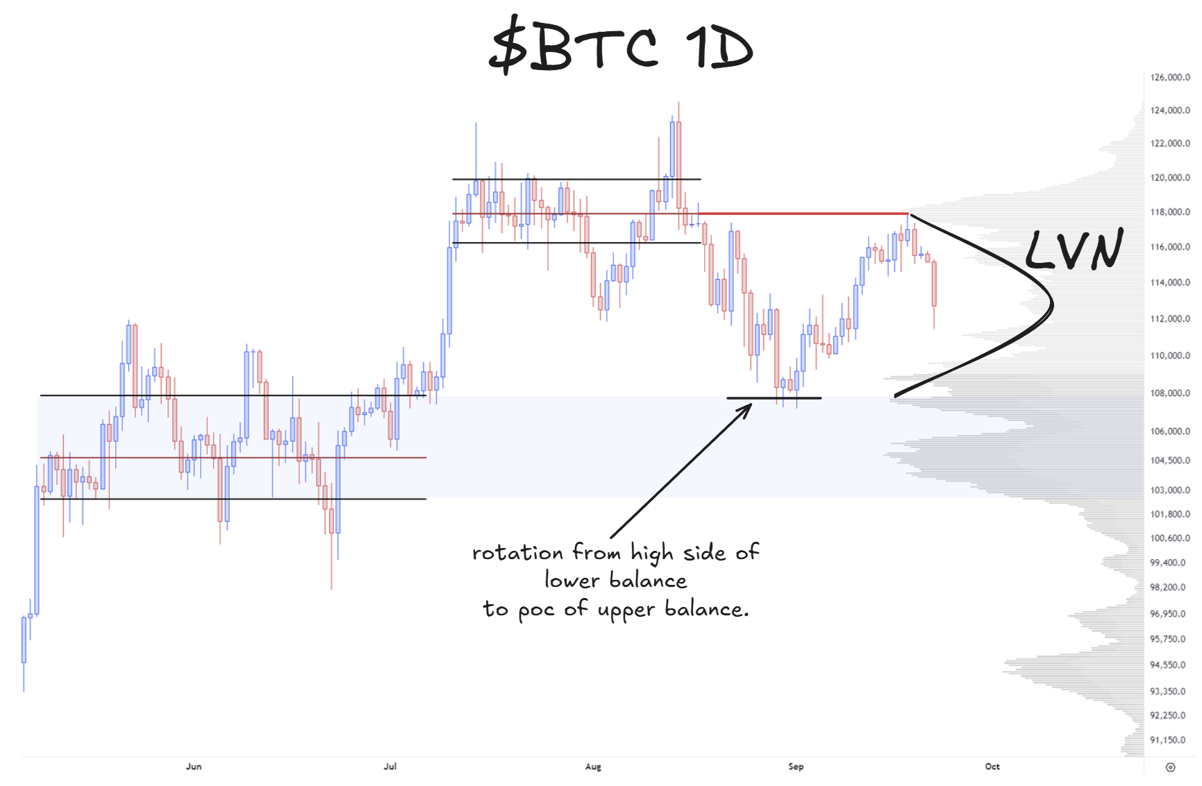 BTC had beautiful rotation from the high side of lower balance to point of control of upper balance.
